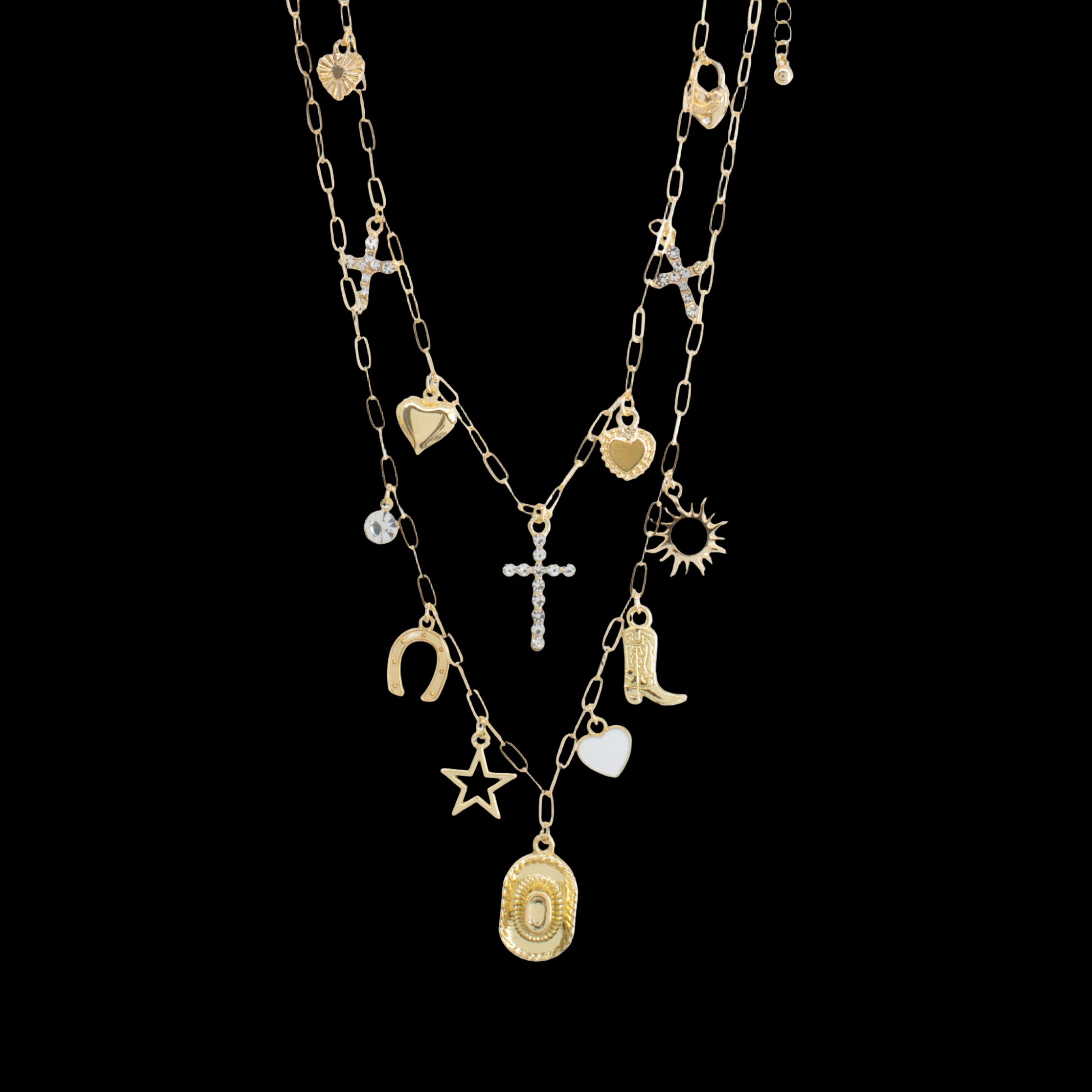 This layered necklace features gold chains adorned with assorted charms including a cross, hearts, cowboy boot, star, horseshoe, and sun. Playful yet chic.