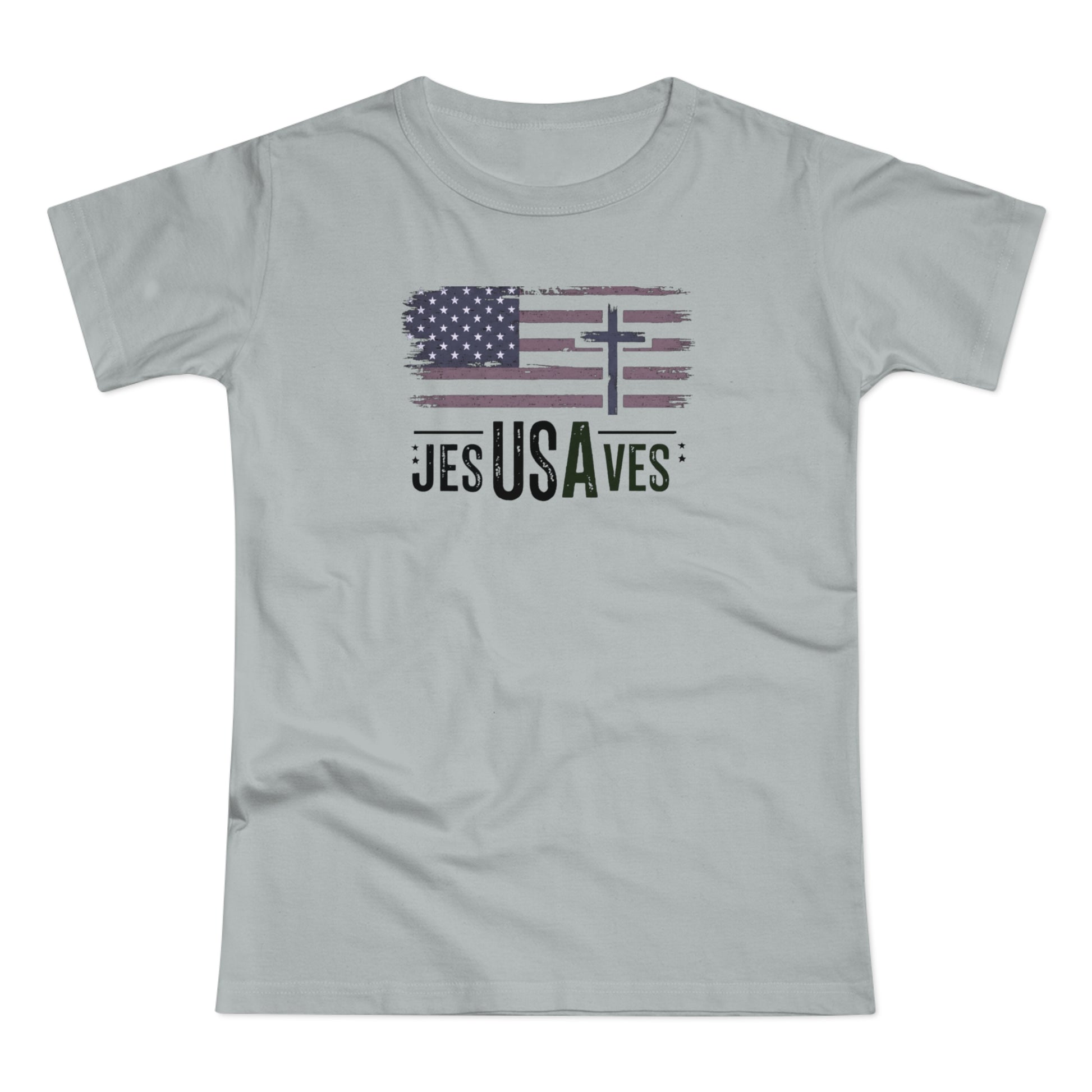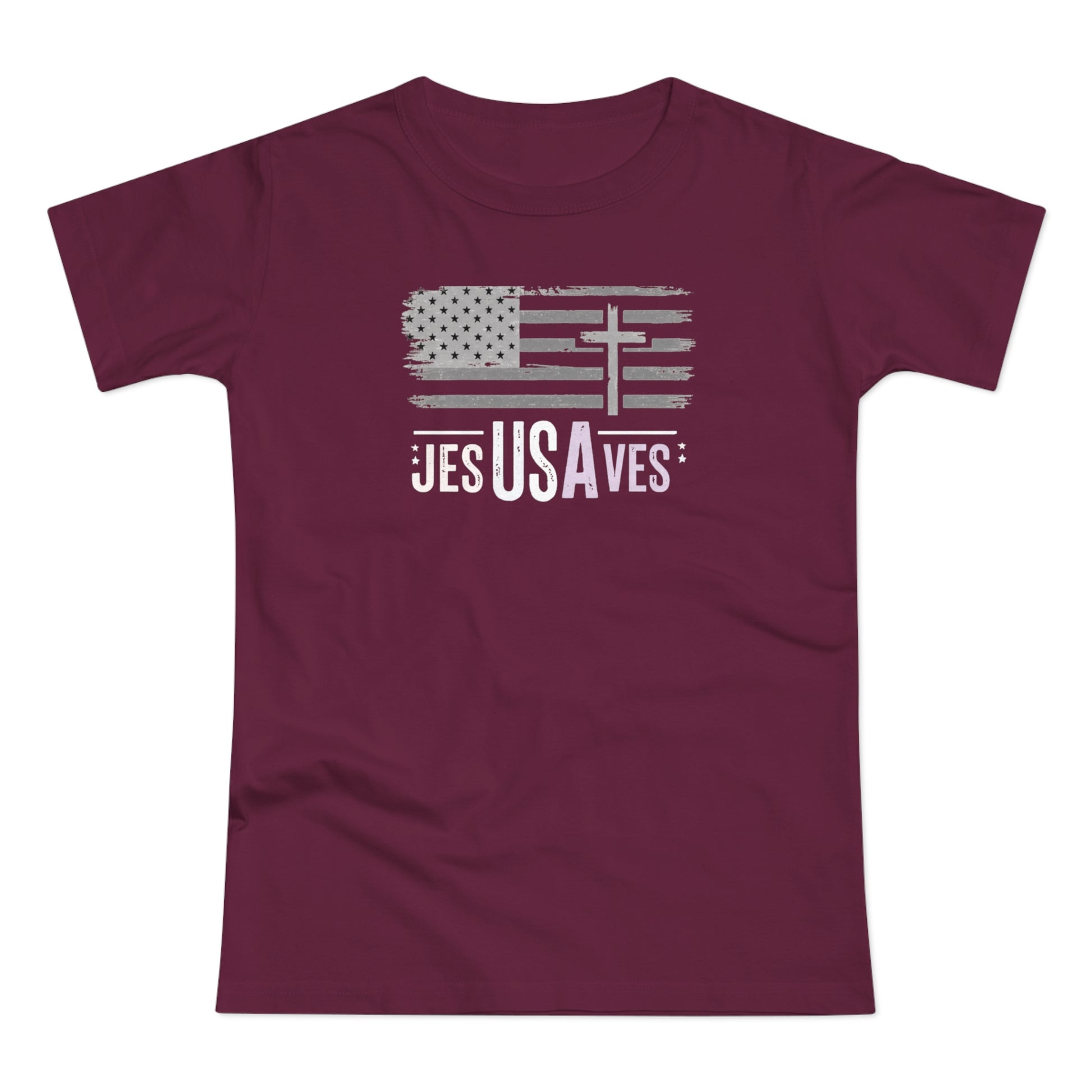 Show your patriotic spirit with this Jesus Saves USA women's t-shirt. Perfect for celebrating Independence Day, Memorial Day, or any other patriotic occasion. This t-shirt gives off a proud and patriotic vibe, fitting effortlessly into the wardrobe of any patriotic woman.