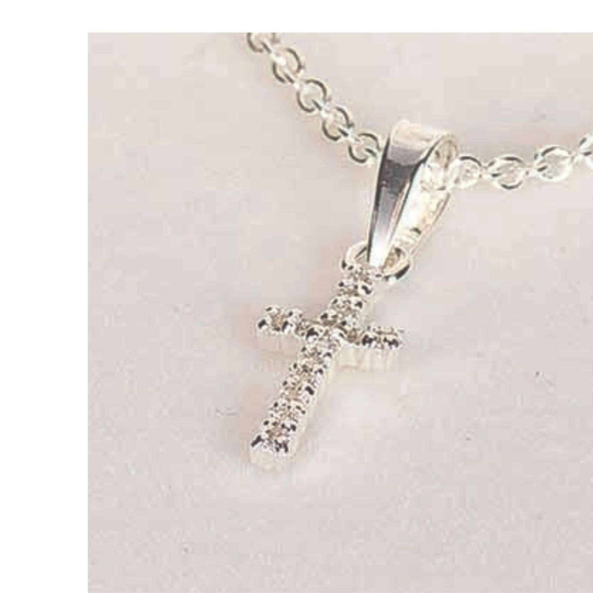 Cubic zirconia mini cross on 16" chain necklace in white gift box small and slender, this dainty cross sparkles with 14 cubic zirconia stones. Makes a wonderful gift for a girl of any age, or for women who prefer a shorter chain and small pendant. Silver plated cross is 1/2" long; silver plated chain is 16". Comes in white fabric covered gift box with hinged lid.