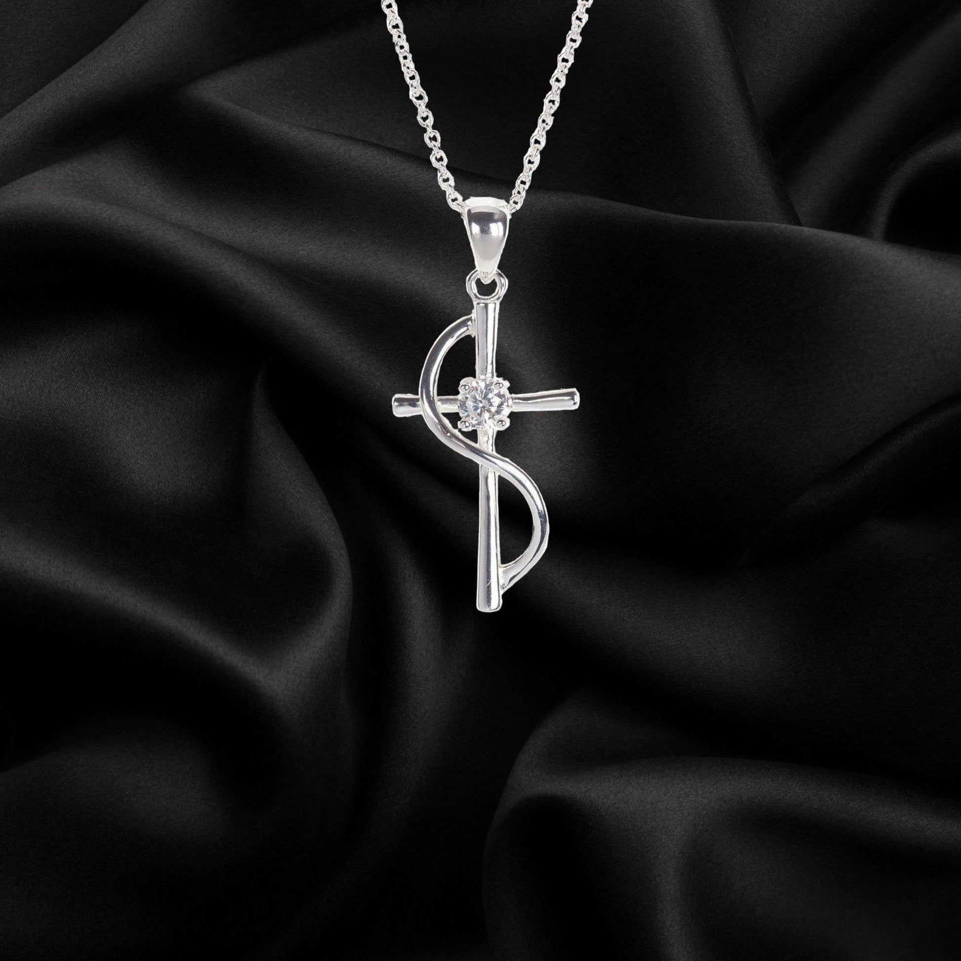 A flowing sash overlay distinguishes this lovely cross with cubic zirconia center accent. Silver plated 1” cross on 18” silver plated chain. Deluxe gift box.