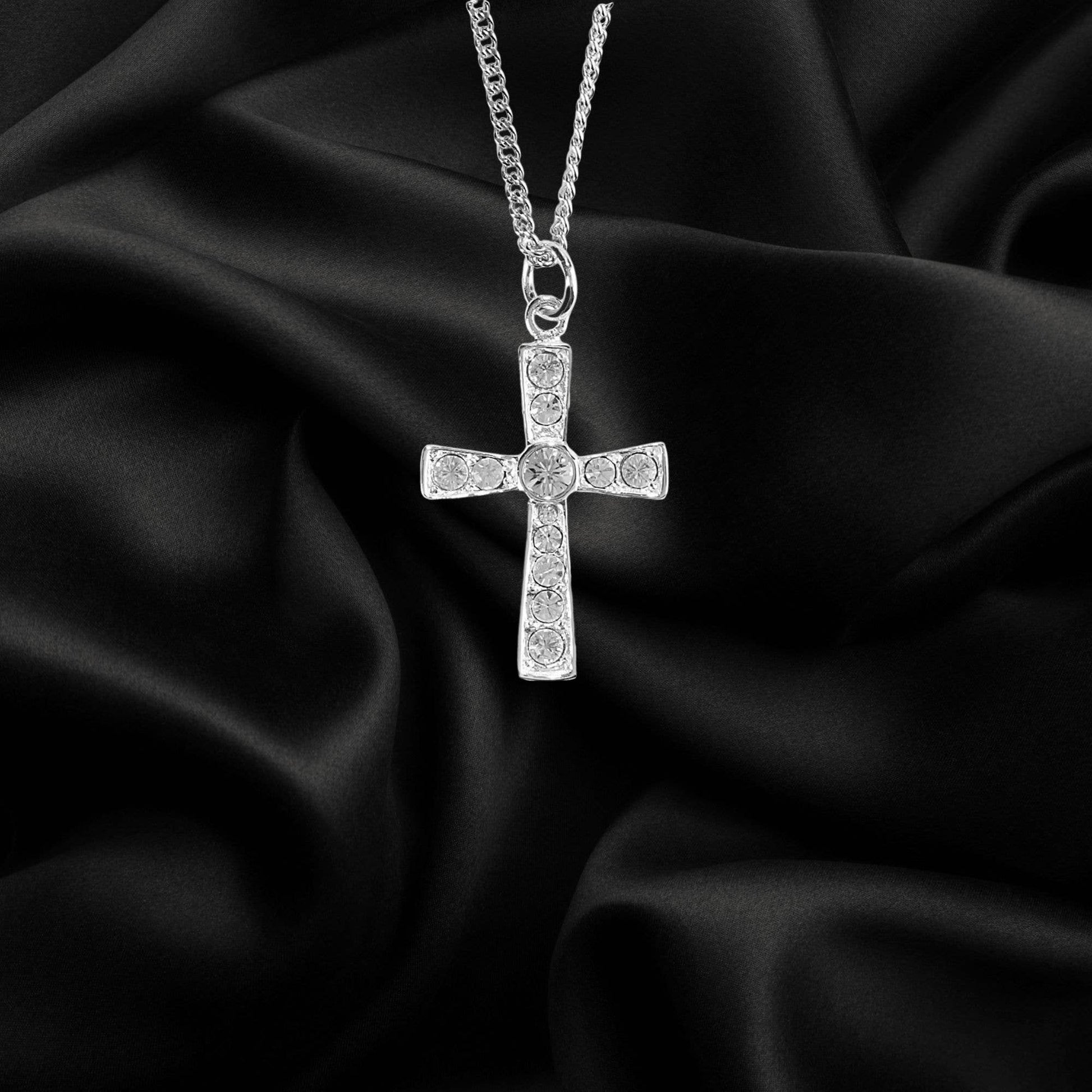 Silver Plated Flare Cross with CZ Stones on oval bale 18 inch Silver Plated Chain