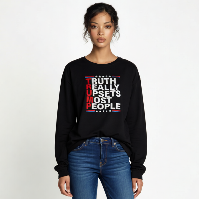 Bold, direct, and unapologetic — this design drops the truth in five letters. "TRUMP: Truth Really Upsets Most People" is printed loud and clear for those who aren’t afraid to stand tall in their beliefs. A clean strong layout with patriotic detail makes this a standout conservative statement shirt.