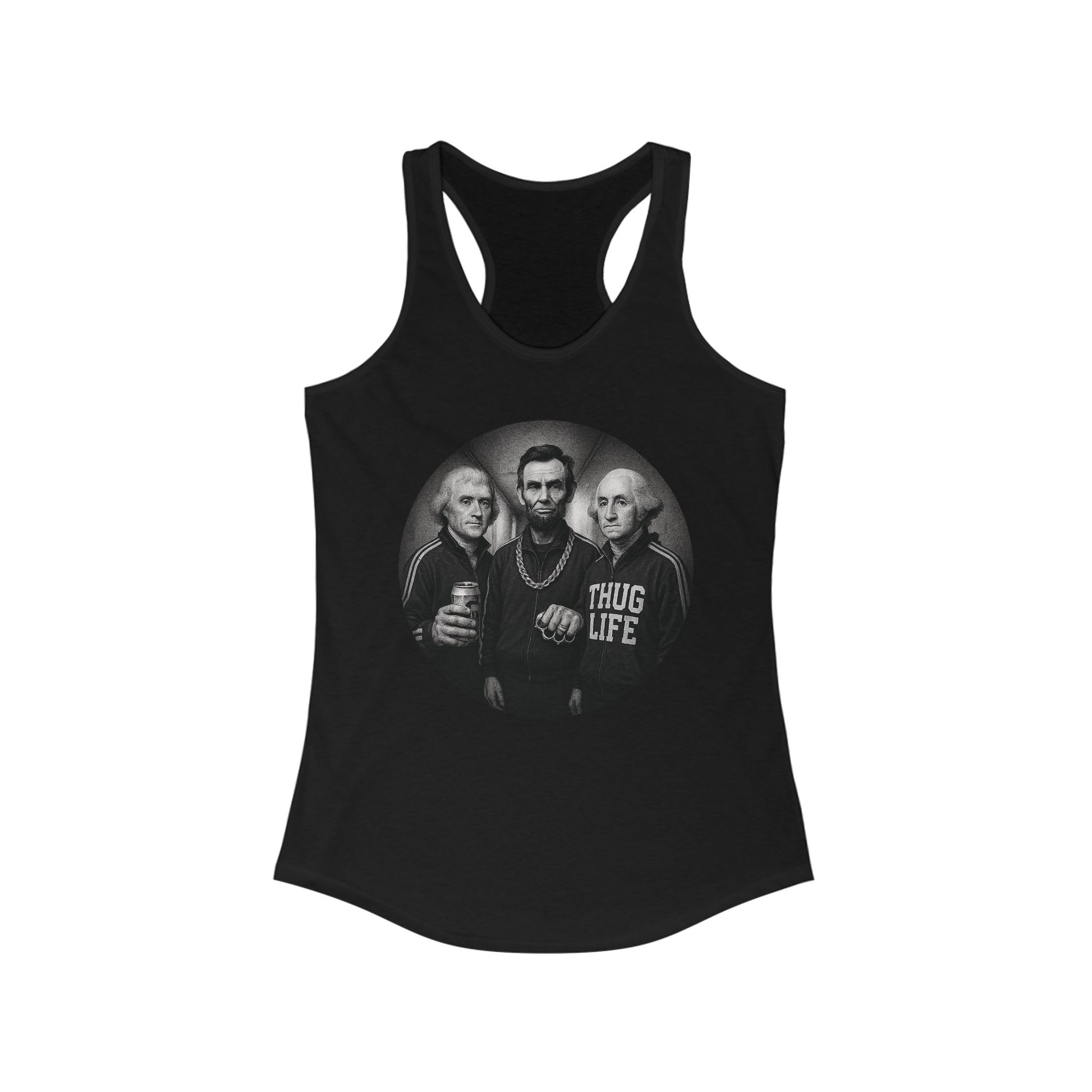 This Funny Founding Fathers Thugs tank top is perfect for women looking for a lightweight and comfortable option for their active lifestyle. The side seams and self fabric binding provide structural support and durability. Made from a luxurious blend of cotton and polyester, this tank is soft to the touch and perfect for printing. The classic fit and scooped neckline give it a sporty vibe, making it a great choice for workouts or casual wear. Ideal for those who appreciate humor and historical references.
