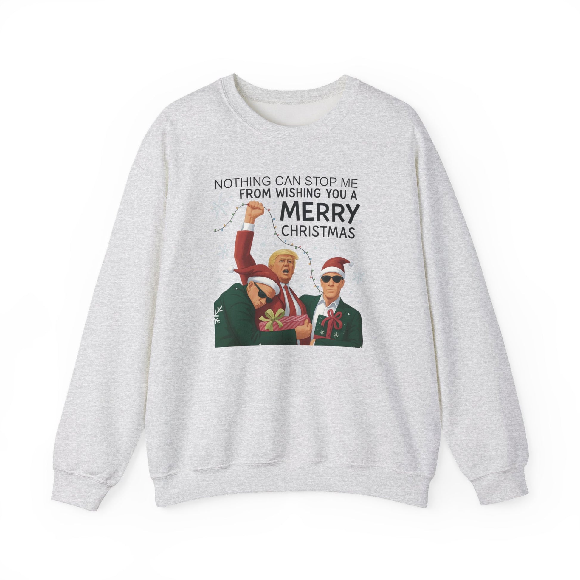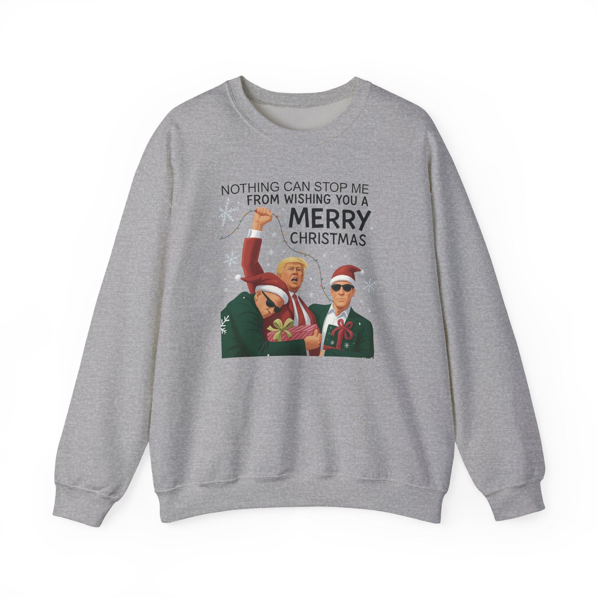 A cozy unisex crewneck sweatshirt featuring a design of Trump saying 'Nothing will stop me from wishing you a merry Christmas'. Perfect for those who enjoy a touch of humor during the holiday season. Suitable for adults and ideal for Christmas celebrations.